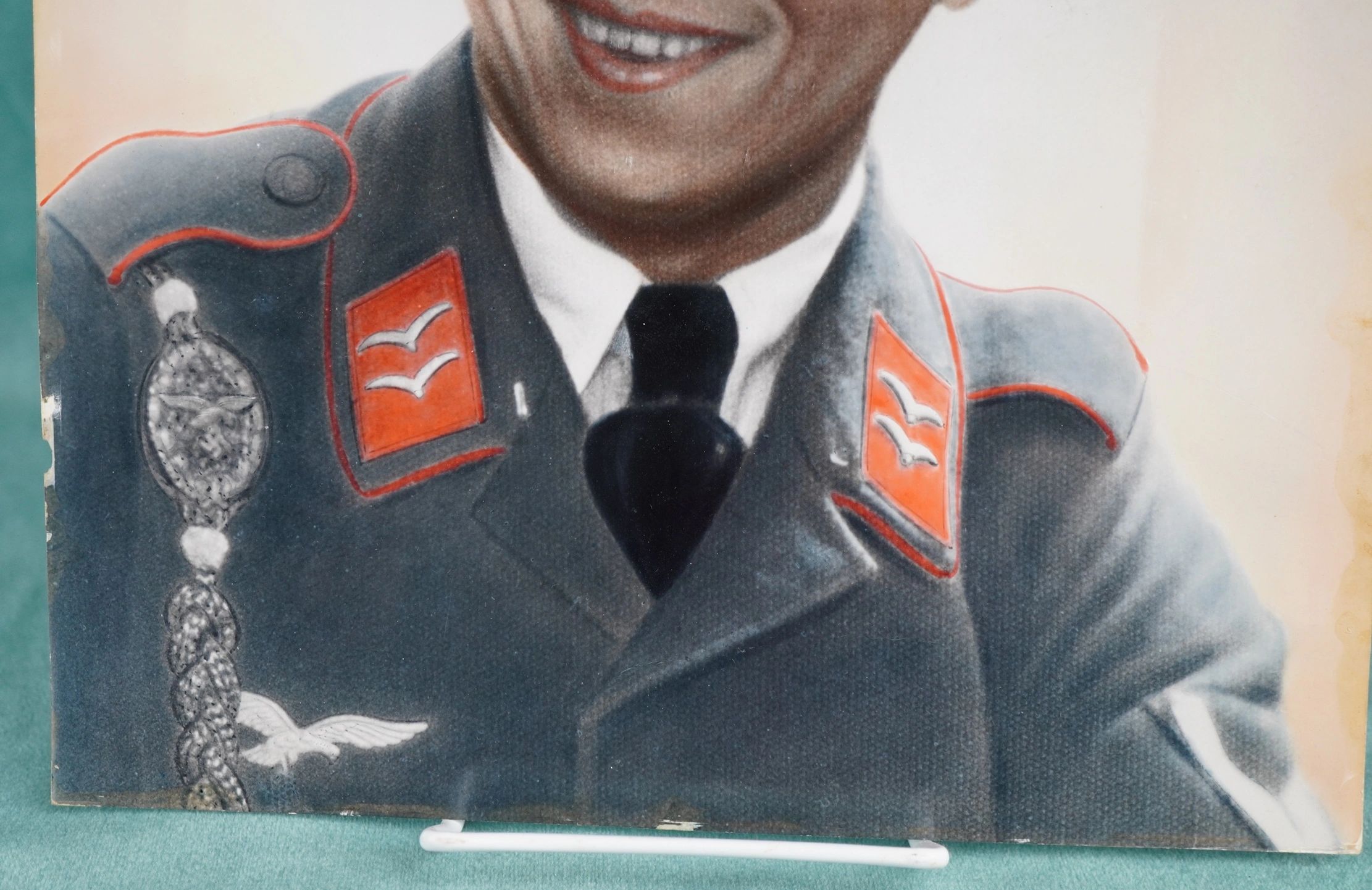 Here is your chance to own a nice photo of a Luftwaffe Flak NCO. His visor and breast eagle are missing the swastika, so likely colorized in the immediate post war years. However, they somehow missed the swastika on his shooting lanyard! Some writing on the reverse. In fair condition overall and would display great with other items! Measures 11-3/4″ tall by about 9-1/2″ wide. With the rise of the Nazi Party and the repudiation of the Versailles Treaty, the Luftwaffe’s existence was publicly acknowledged on 26 February 1935, just over two weeks before open defiance of the Versailles Treaty through German re-armament and conscription would be announced on 16 March. The Condor Legion, a Luftwaffe detachment sent to aid Nationalist forces in the Spanish Civil War, provided the force with a valuable testing ground for new tactics and aircraft. Partially as a result of this combat experience, the Luftwaffe had become one of the most sophisticated, technologically advanced, and battle-experienced air forces in the world when World War II broke out in 1939. The Luftwaffe also operated Fallschirmjäger paratrooper units.The Luftwaffe proved instrumental in the German victories across Poland and Western Europe in 1939 and 1940. During the Battle of Britain, however, despite inflicting severe damage to the RAF’s infrastructure and, during the subsequent Blitz, devastating many British cities, the German air force failed to batter the beleaguered British into submission. From 1942, Allied bombing campaigns gradually destroyed the Luftwaffe ‘s fighter arm. From late 1942, the Luftwaffe used its surplus ground, support and other personnel to raise Luftwaffe Field Divisions. In addition to its service in the West, the Luftwaffe operated over the Soviet Union, North Africa and Southern Europe. Despite its belated use of advanced turbojet and rocket propelled aircraft for the destruction of Allied bombers, the Luftwaffe was overwhelmed by the Allies’ superior numbers and improved tactics, and a lack of trained pilots and aviation fuel. In January 1945, during the closing stages of the Battle of the Bulge, the Luftwaffe made a last-ditch effort to win air superiority, and met with failure. With rapidly dwindling supplies of petroleum, oil, and lubricants after this campaign, and as part of the entire combined Wehrmacht military forces as a whole, the Luftwaffe ceased to be an effective fighting force. Free shipping ANYWHERE IN THE WORLD & I don’t charge PayPal fees like some of the other guys!