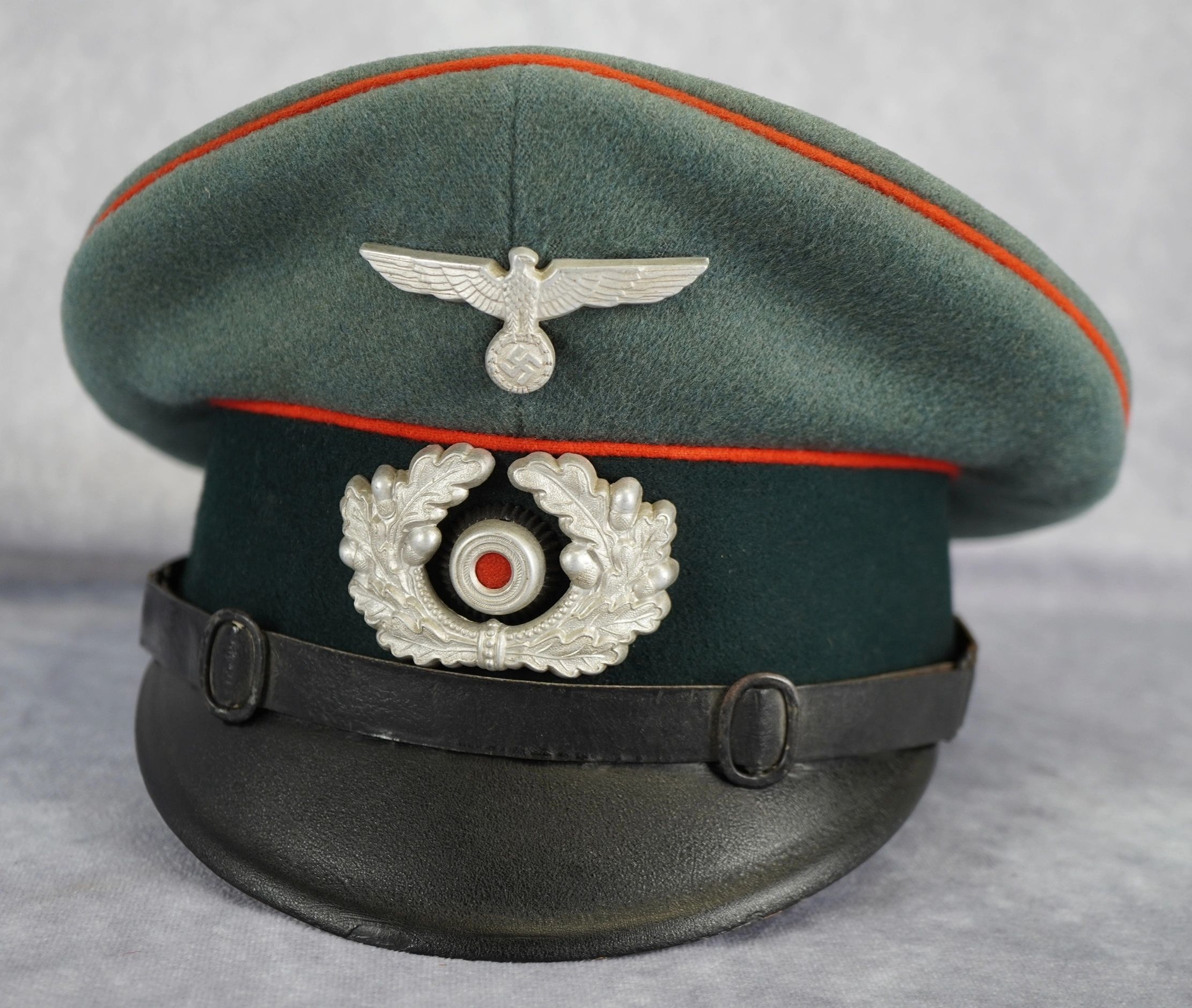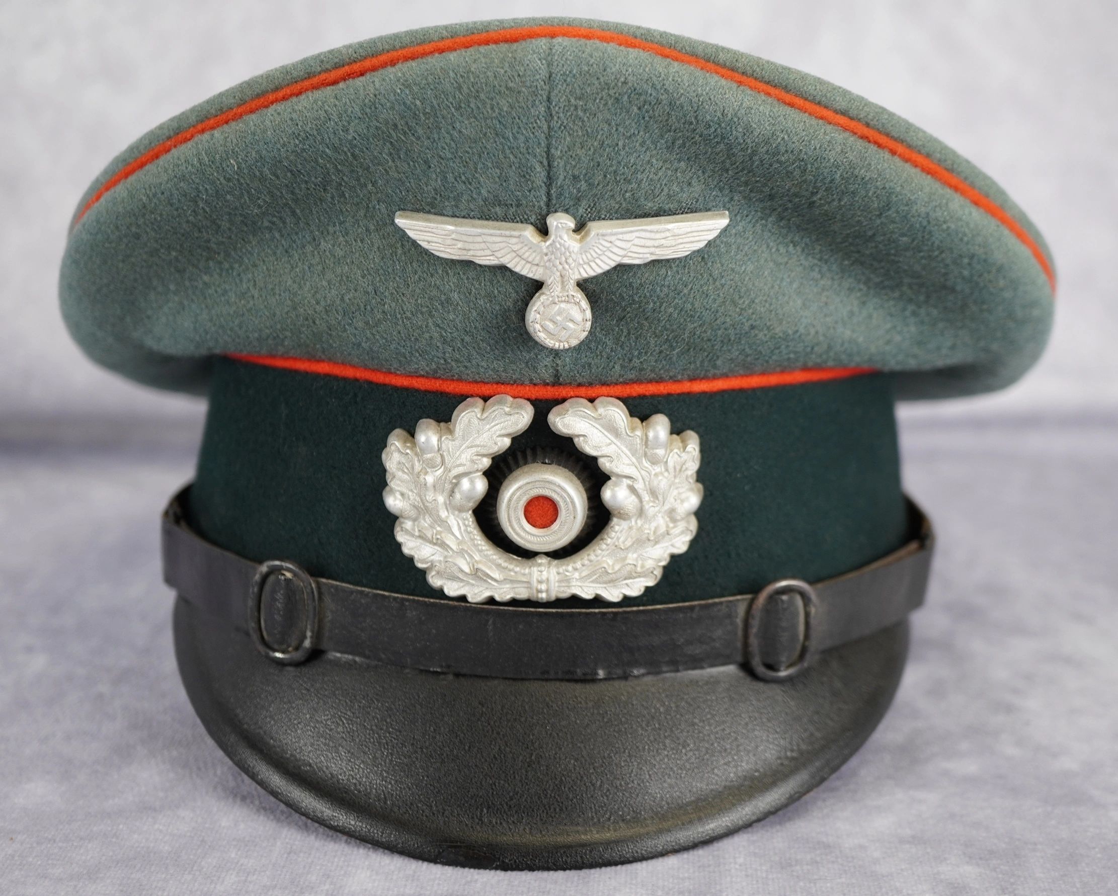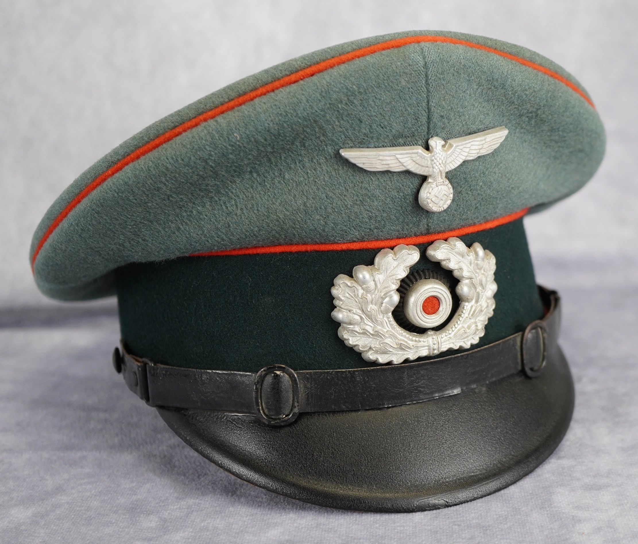 Here is your chance to pick up a gorgeous Heer artillery visor cap. This example is fair condition with minimal moth damage to the piping. Nice matching pair of aluminum visor insignia. Doeskin wool exterior Interior lining exhibits signs of use throughout. Named and unit marked in the sweatshield. Great shape overall. A nice cap if you aren’t trying to break the bank! The Heer was the land forces component of the Wehrmacht, the regular German Armed Forces, from 1935 until it ceased to exist in 1945 and then formally dissolved in August 1946. During World War II, a total of about 13.6 million soldiers served in the German Army. Germany’s army personnel were made up of volunteers and conscripts. Only 17 months after Adolf Hitler announced publicly the German rearmament program, the Army reached its projected goal of 36 divisions. During the autumn of 1937, two more corps were formed. In 1938 four additional corps were formed with the inclusion of the five divisions of the Austrian Army after the Anschluss in March. During the period of its expansion under Hitler, the German Army continued to develop concepts pioneered during World War I, combining ground (Army) and air (Luftwaffe) assets into combined arms forces. The German military managed quick victories in the two initial years of World War II, a new style of warfare described as Blitzkrieg for its speed and destructive power. Free shipping ANYWHERE IN THE WORLD & I don’t charge PayPal fees like some of the other guys!
