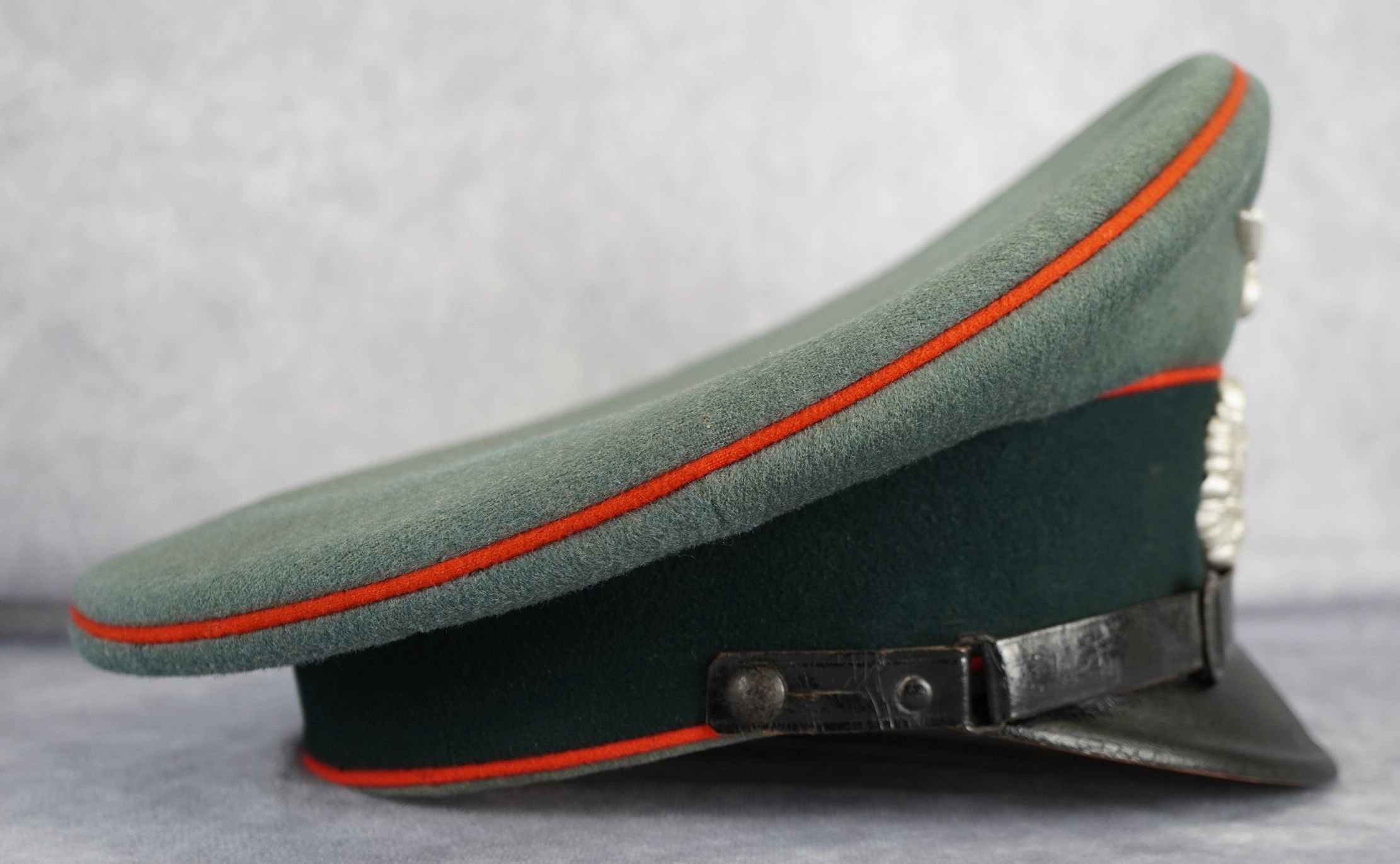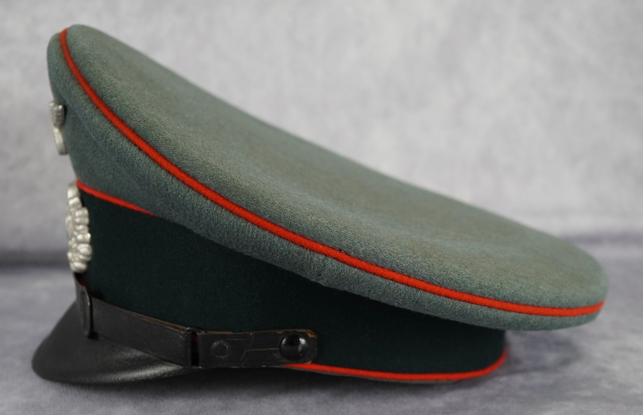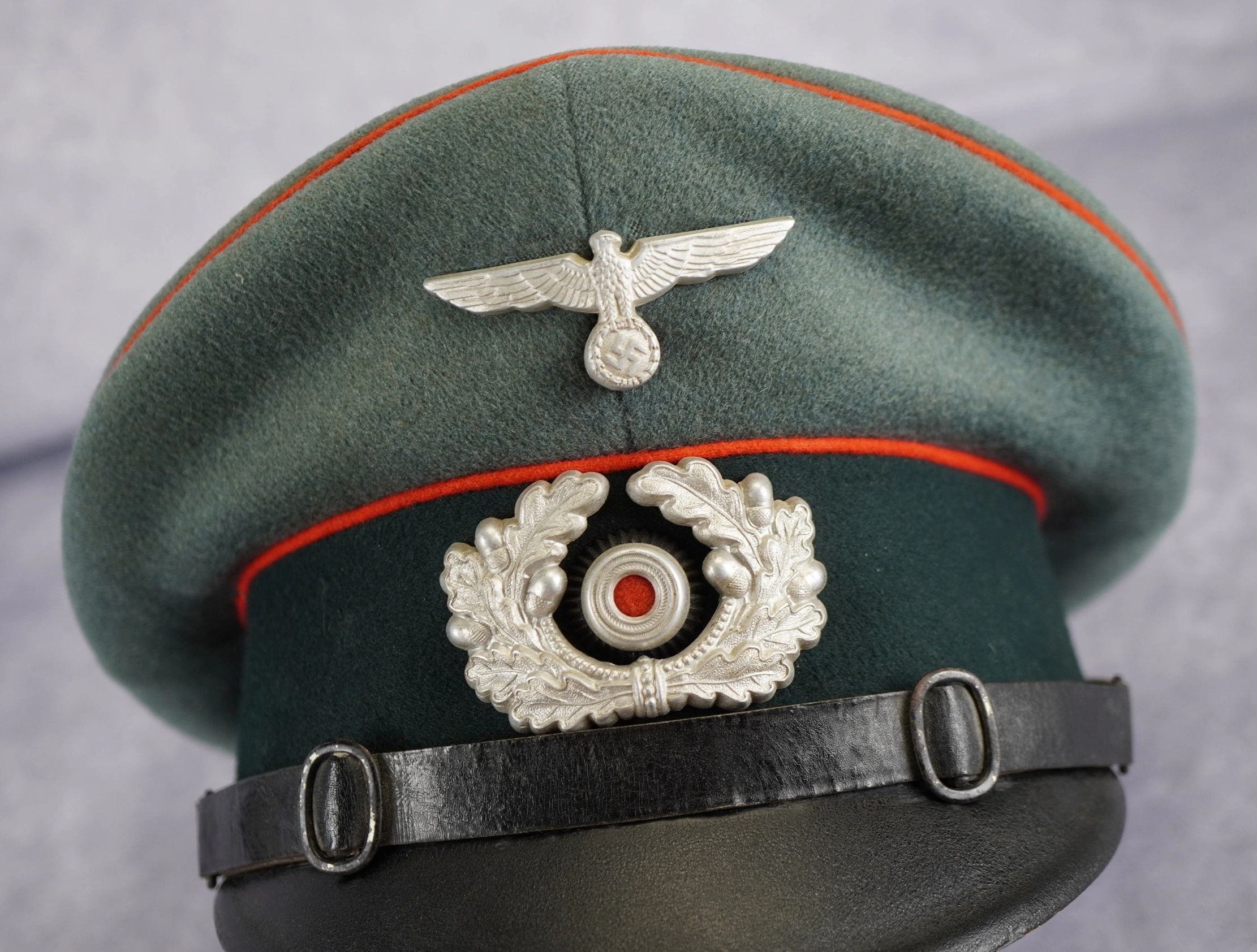 Here is your chance to pick up a gorgeous Heer artillery visor cap. This example is fair condition with minimal moth damage to the piping. Nice matching pair of aluminum visor insignia. Doeskin wool exterior Interior lining exhibits signs of use throughout. Named and unit marked in the sweatshield. Great shape overall. A nice cap if you aren’t trying to break the bank! The Heer was the land forces component of the Wehrmacht, the regular German Armed Forces, from 1935 until it ceased to exist in 1945 and then formally dissolved in August 1946. During World War II, a total of about 13.6 million soldiers served in the German Army. Germany’s army personnel were made up of volunteers and conscripts. Only 17 months after Adolf Hitler announced publicly the German rearmament program, the Army reached its projected goal of 36 divisions. During the autumn of 1937, two more corps were formed. In 1938 four additional corps were formed with the inclusion of the five divisions of the Austrian Army after the Anschluss in March. During the period of its expansion under Hitler, the German Army continued to develop concepts pioneered during World War I, combining ground (Army) and air (Luftwaffe) assets into combined arms forces. The German military managed quick victories in the two initial years of World War II, a new style of warfare described as Blitzkrieg for its speed and destructive power. Free shipping ANYWHERE IN THE WORLD & I don’t charge PayPal fees like some of the other guys!