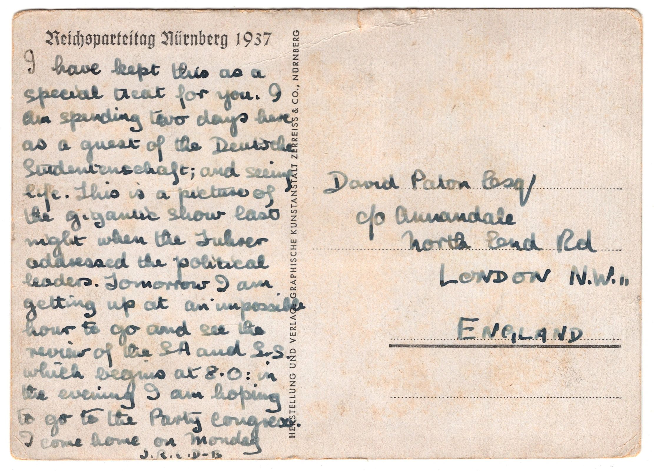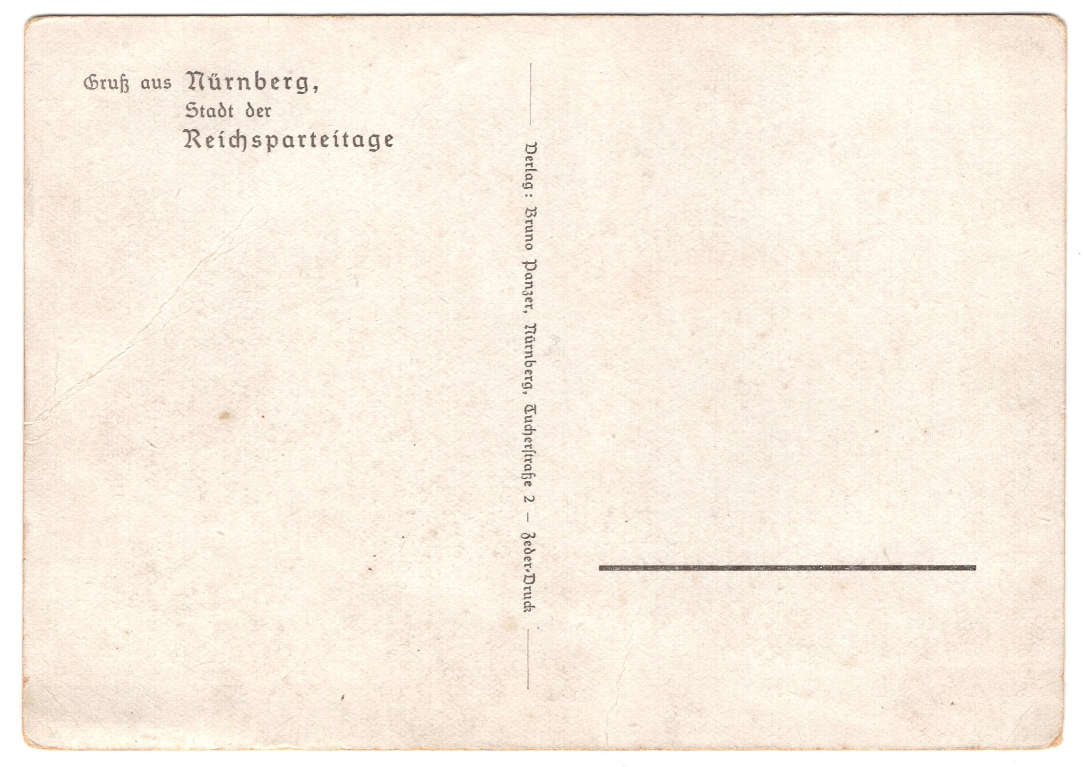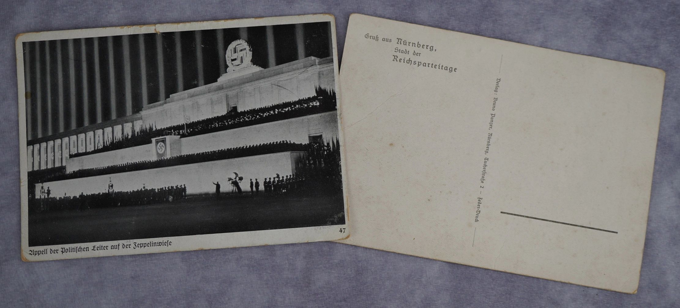 Here is your chance to own an impressive pair of postcards. The postcard was mailed to London by an Englishman visiting Germany during the Reichsparteitag celebrations. He accounts Hitler speaking in the message on the reverse. He also accounts how tomorrow is the review of SA and SS men, which the additional second postcard illustrates. A great pair and extremely interesting English language account of a Reichsparteitag rally. In fair condition overall and would display great with other items! Free shipping ANYWHERE IN THE WORLD & I don’t charge PayPal fees like some of the other guys!