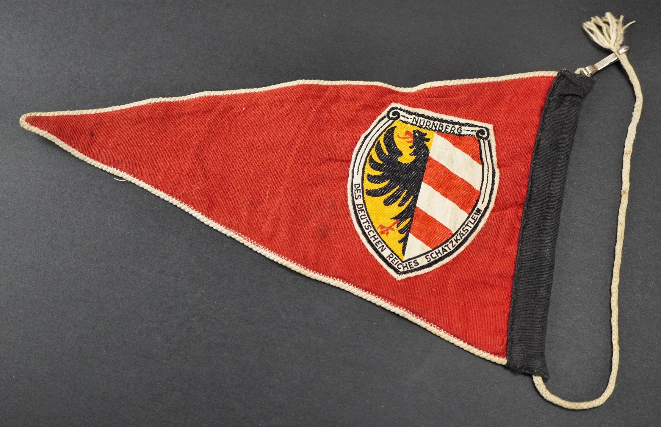 Here is your chance to pick up a beautiful pennant a Reichsparteitag event. A 1936 example with the stylized rally design on one side and the city shield of Nuremberg on the reverse side. White twisted border. Complete with the period string and clip. The National Socialist German Workers’ Party ( Nationalsozialistische Deutsche Arbeiterpartei , abbreviated NSDAP), was a far-right political party in Germany that was active between 1920 and 1945, that created and supported the ideology of National Socialism. The Nazi Party emerged from the German nationalist, racist and populist Freikorps paramilitary culture, which fought against the communist uprisings in post-World War I Germany. Initially, Nazi political strategy focused on anti-big business, anti-bourgeois, and anti-capitalist rhetoric, although this was later downplayed to gain the support of business leaders, and in the 1930s the party’s main focus shifted to anti-Semitic and anti-Marxist themes. Adolf Hitler, the party’s leader since 1921, was appointed Chancellor of Germany by President Paul von Hindenburg on 30 January 1933. Hitler rapidly established a totalitarian regime known as the Third Reich. After the death of President Hindenburg on 2 August 1934, Hitler merged the offices of party leader, head of state and chief of government in one, taking the title of Führer und Reichskanzler . The NSDAP would control Germany until the end of the war. Free shipping ANYWHERE IN THE WORLD & I don’t charge PayPal fees like some of the other guys!