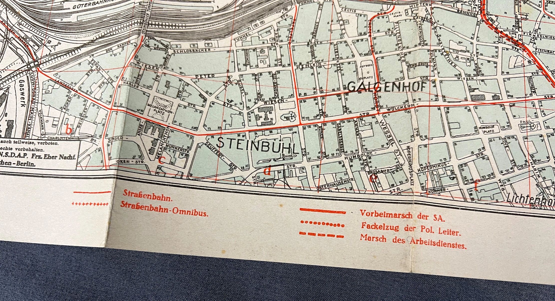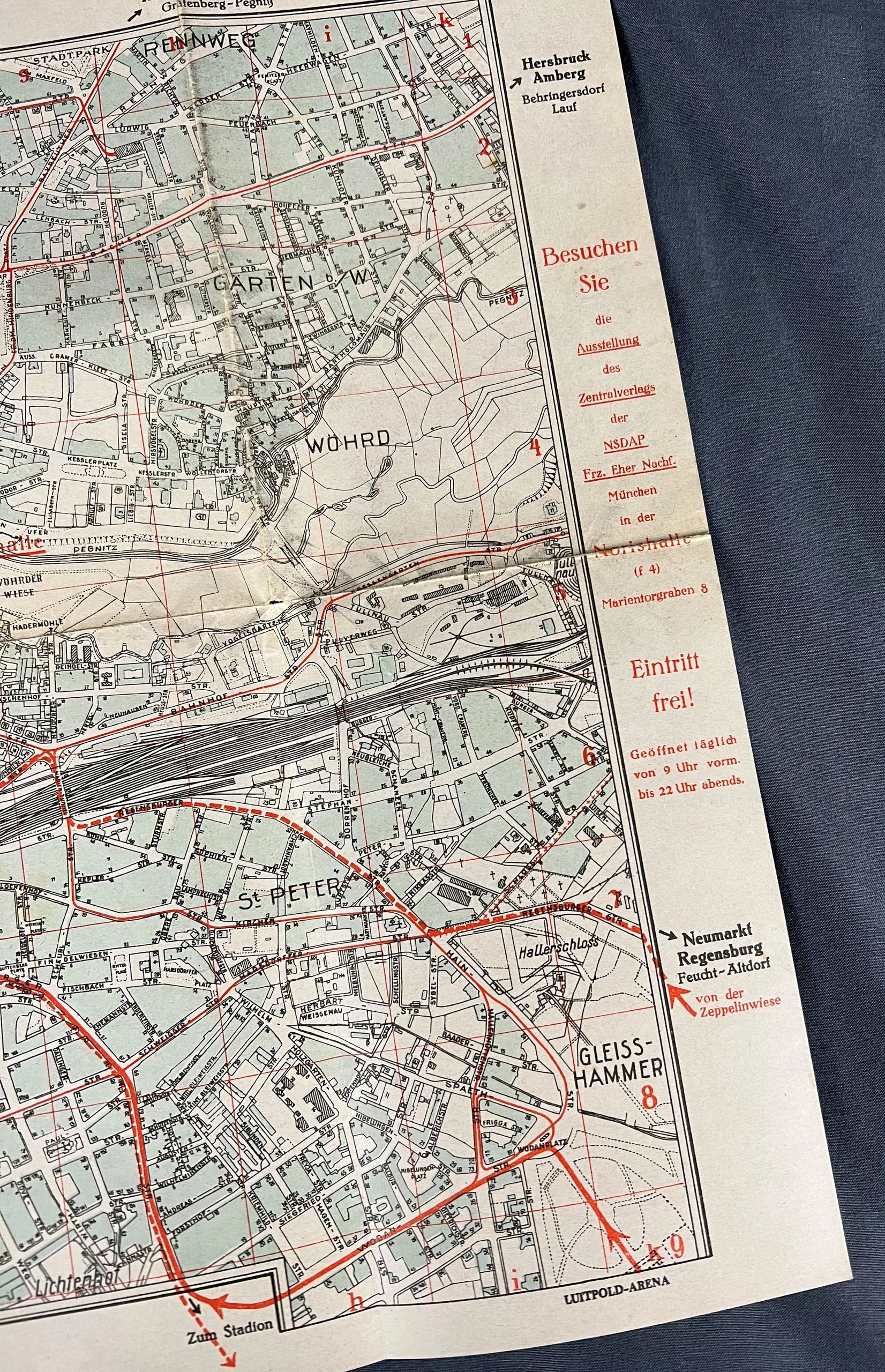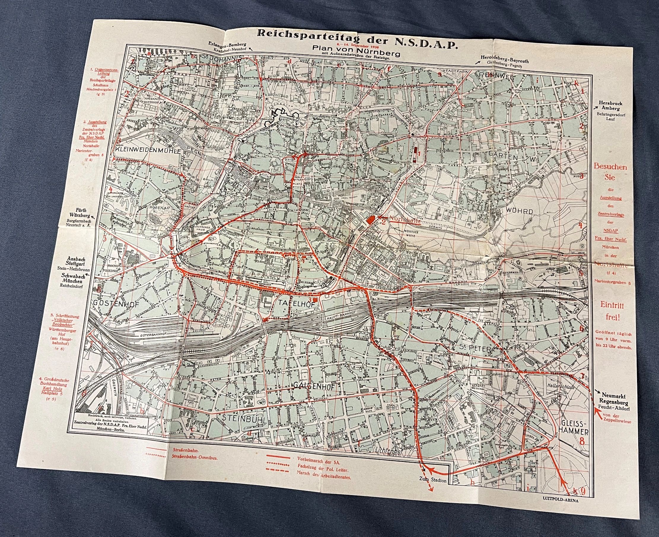 Here is your chance to own an impressive Reichsparteitag map. Minor wear as seen in photos. Given out to tourists during the Nazi era at the Reichsparteitag events, which shows where each of the events would pass through in Nuremberg. A very interesting piece that is perfect for your collection. The National Socialist German Workers’ Party ( Nationalsozialistische Deutsche Arbeiterpartei , abbreviated NSDAP), was a far-right political party in Germany that was active between 1920 and 1945, that created and supported the ideology of National Socialism. The Nazi Party emerged from the German nationalist, racist and populist Freikorps paramilitary culture, which fought against the communist uprisings in post-World War I Germany. Initially, Nazi political strategy focused on anti-big business, anti-bourgeois, and anti-capitalist rhetoric, although this was later downplayed to gain the support of business leaders, and in the 1930s the party’s main focus shifted to anti-Semitic and anti-Marxist themes. Adolf Hitler, the party’s leader since 1921, was appointed Chancellor of Germany by President Paul von Hindenburg on 30 January 1933. Hitler rapidly established a totalitarian regime known as the Third Reich. After the death of President Hindenburg on 2 August 1934, Hitler merged the offices of party leader, head of state and chief of government in one, taking the title of Führer und Reichskanzler . The NSDAP would control Germany until the end of the war. Free shipping ANYWHERE IN THE WORLD & I don’t charge PayPal fees like some of the other guys!