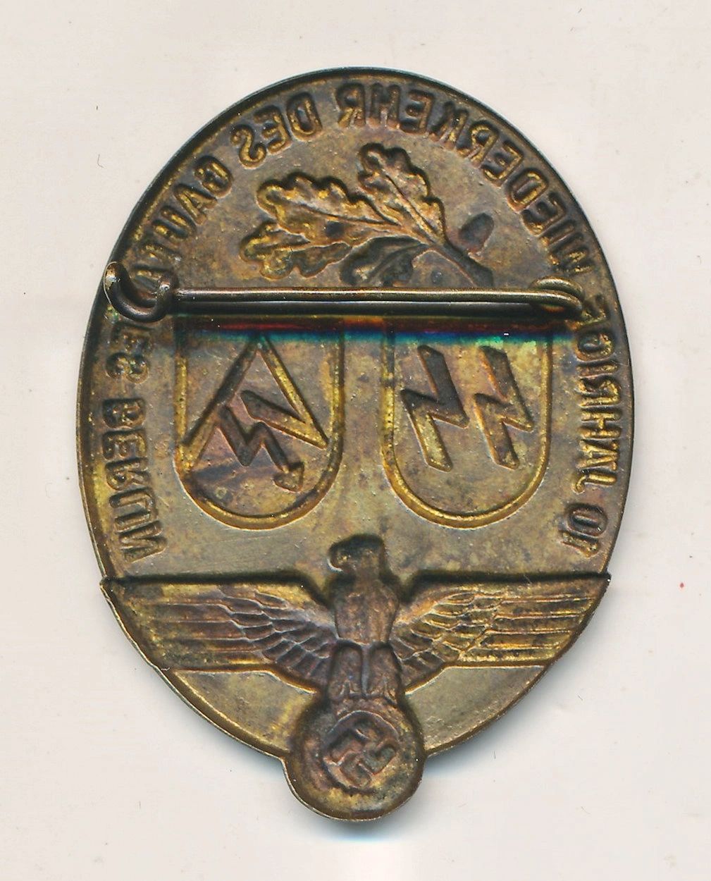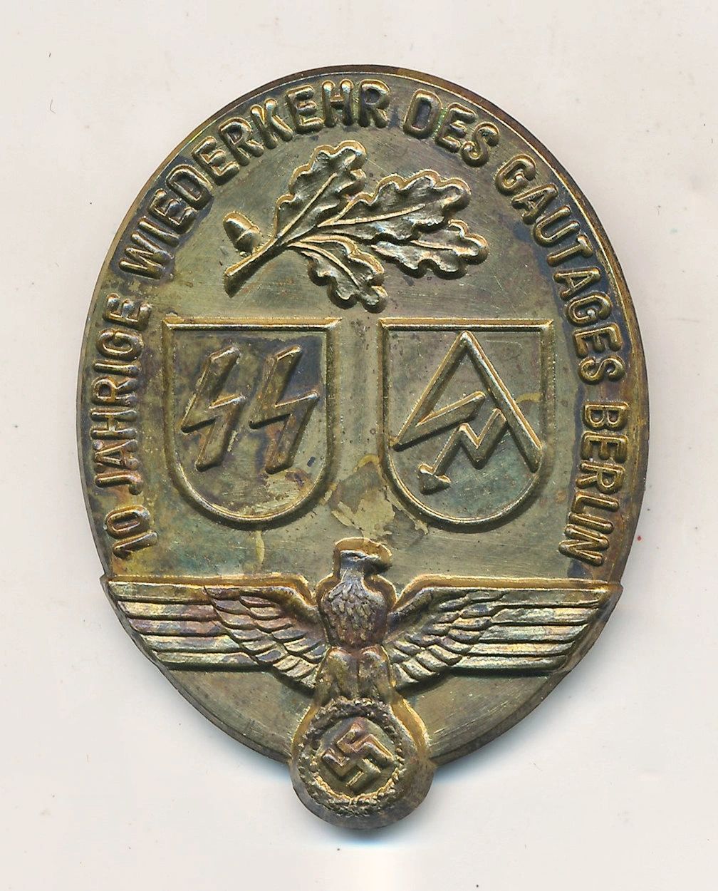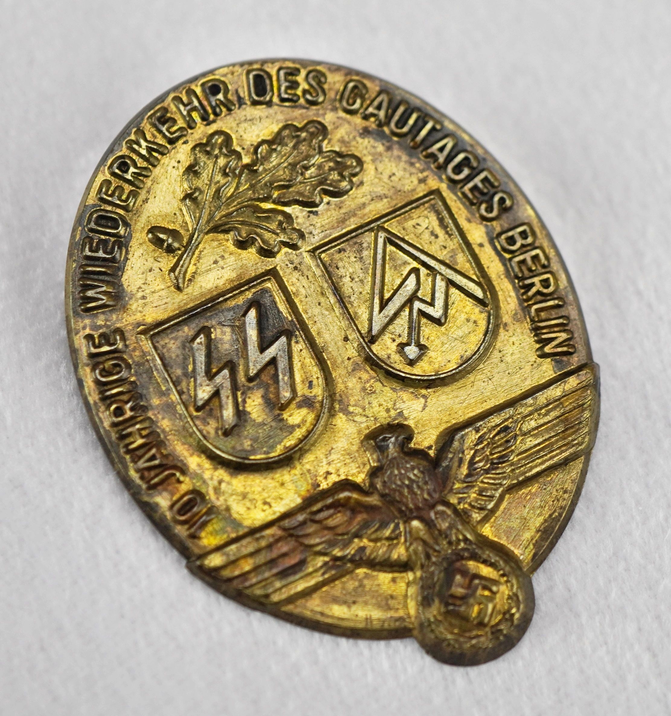 Here is your chance to pick up a wonderful tinnie for the 10th anniversary of Gau Berlin. Unmarked on the reverse and produced in tombak. A rare tinnie that you don’t see too often so don’t miss out! The Schutzstaffel (SS) was a major paramilitary organization under Adolf Hitler in Nazi Germany, and later throughout German-occupied Europe during World War II. It began with a small guard unit known as the Saal-Schutz (“Hall Security”) made up of NSDAP volunteers to provide security for party meetings in Munich. In 1925, Heinrich Himmler joined the unit, which had by then been reformed and given its final name. Under his direction (1929–45) it grew from a small paramilitary formation during the Weimar Republic to one of the most powerful organizations in Nazi Germany. From 1929 until the regime’s collapse in 1945, the SS was the foremost agency of security, surveillance, and terror within Germany and German-occupied Europe. The two main constituent groups were the Allgemeine SS (General SS) and Waffen-SS (Armed SS). The Allgemeine SS was responsible for enforcing the racial policy of Nazi Germany and general policing, whereas the Waffen-SS consisted of combat units within Nazi Germany’s military. A third component of the SS, the SS-Totenkopfverbände (SS-TV), ran the concentration camps and extermination camps. Additional subdivisions of the SS included the Gestapo and the Sicherheitsdienst (SD) organizations. They were tasked with the detection of actual or potential enemies of the Nazi state, the neutralization of any opposition, policing the German people for their commitment to Nazi ideology, and providing domestic and foreign intelligence. Free shipping ANYWHERE IN THE WORLD & I don’t charge PayPal fees like some of the other guys!