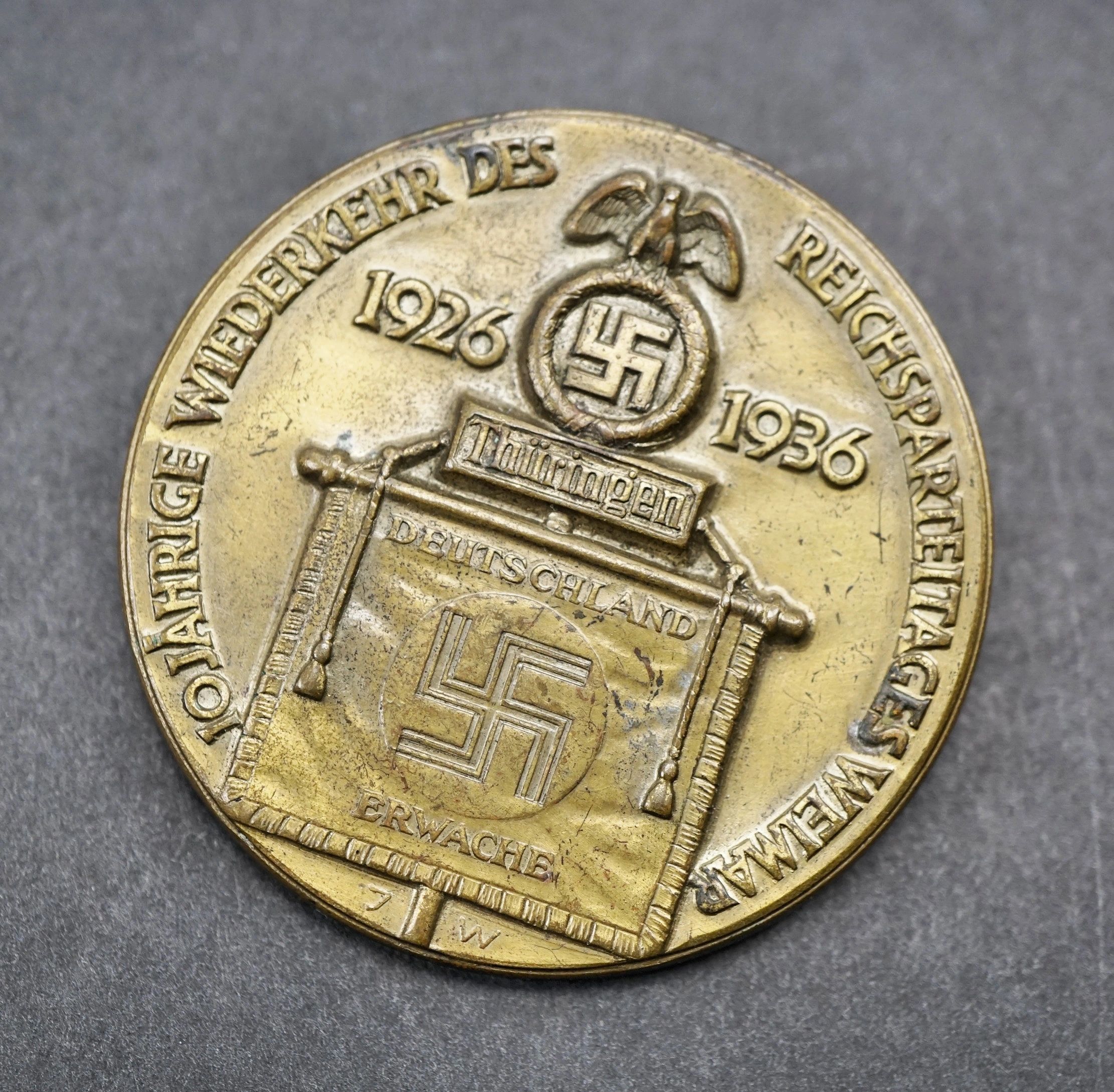 Here is your chance to pick up a wonderful tinnie for the 10 year anniversary of the first Reichsparteitag. Produced in brass with a soldered pin. Maker marked for Jena Werstein on the reverse. I like pieces like this because not only are they extremely affordable but each one is it’s own little work of art in a sense.The National Socialist German Workers’ Party (Nationalsozialistische Deutsche Arbeiterpartei, abbreviated NSDAP), was a far-right political party in Germany that was active between 1920 and 1945, that created and supported the ideology of National Socialism. The Nazi Party emerged from the German nationalist, racist and populist Freikorps paramilitary culture, which fought against the communist uprisings in post-World War I Germany. Initially, Nazi political strategy focused on anti-big business, anti-bourgeois, and anti-capitalist rhetoric, although this was later downplayed to gain the support of business leaders, and in the 1930s the party’s main focus shifted to anti-Semitic and anti-Marxist themes. Adolf Hitler, the party’s leader since 1921, was appointed Chancellor of Germany by President Paul von Hindenburg on 30 January 1933. Hitler rapidly established a totalitarian regime known as the Third Reich. After the death of President Hindenburg on 2 August 1934, Hitler merged the offices of party leader, head of state and chief of government in one, taking the title of Führer und Reichskanzler. The NSDAP would control Germany until the end of the war. Free shipping ANYWHERE IN THE WORLD & I don’t charge PayPal fees like some of the other guys!