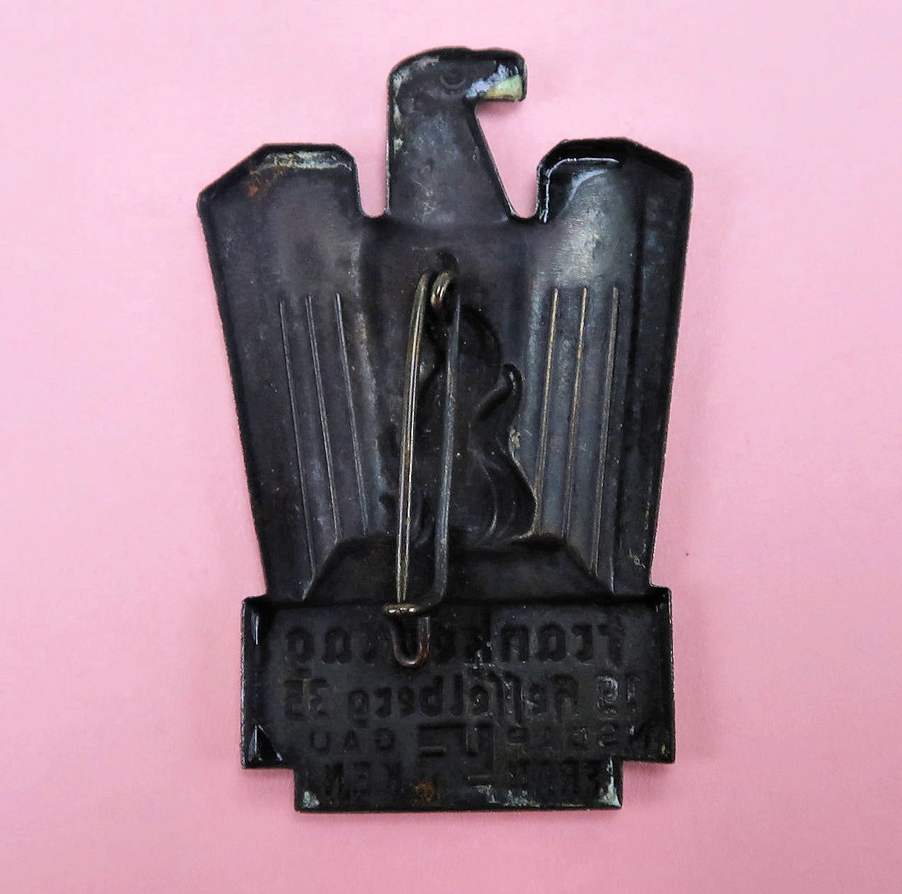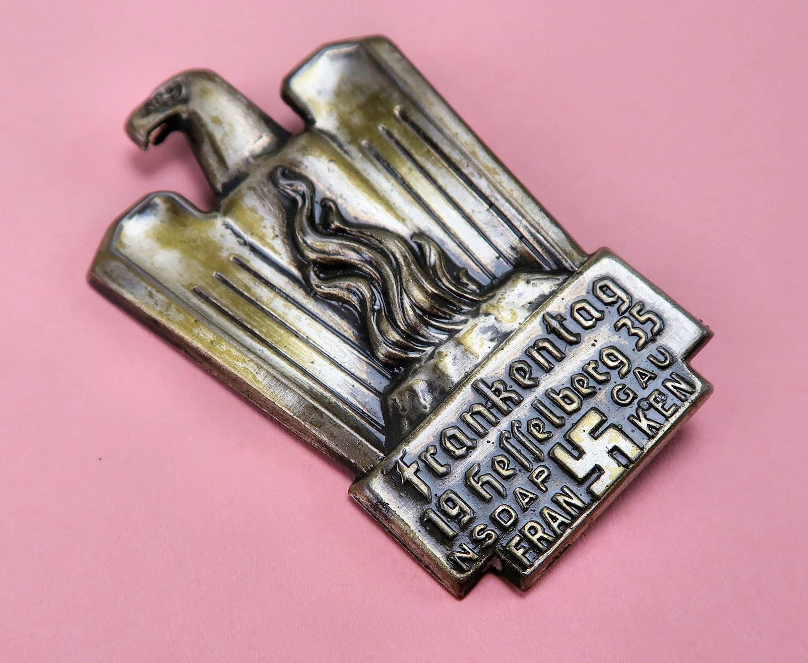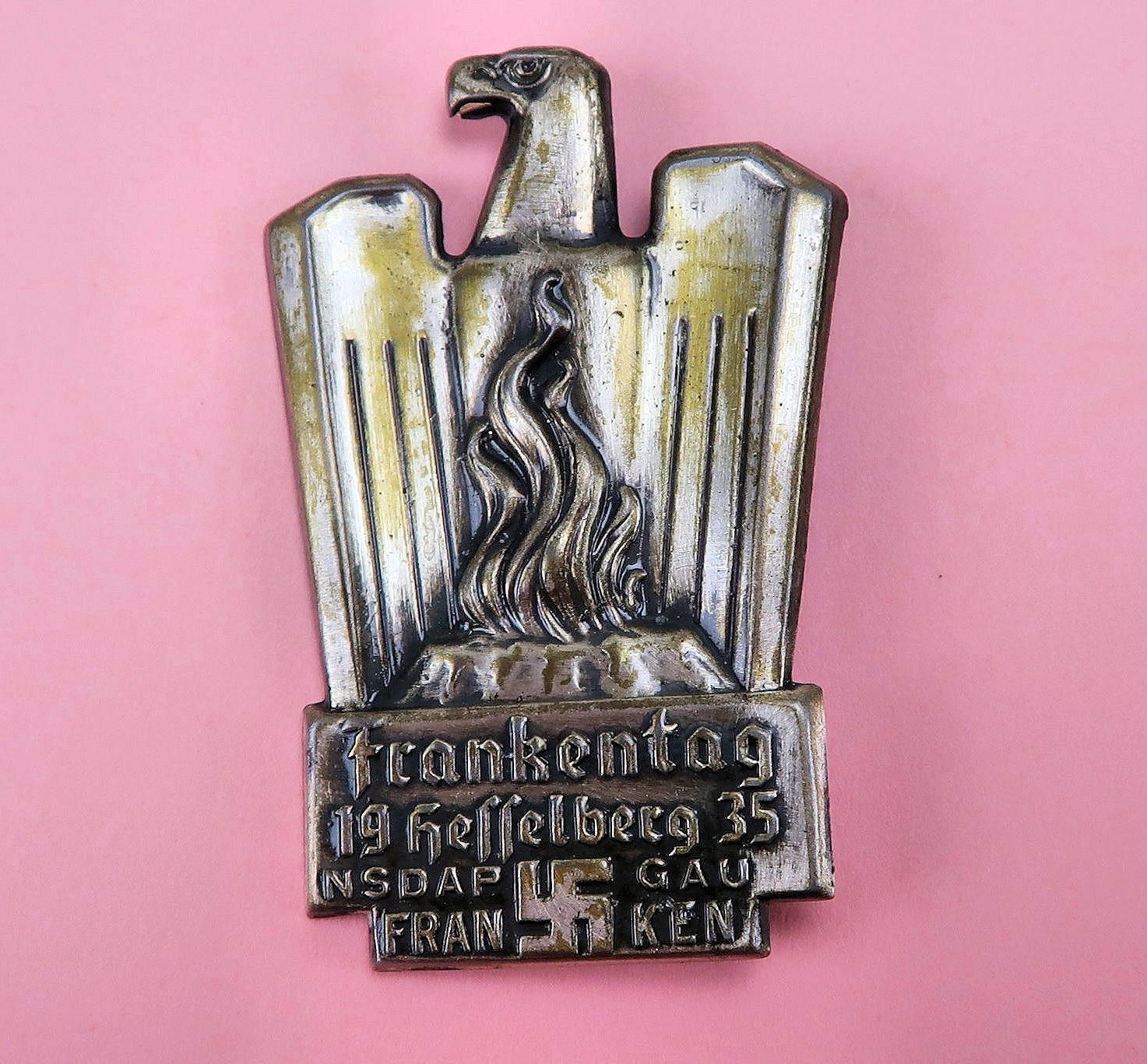 Here is your chance to pick up a wonderful tinnie for the Frankentag event held in Hesselberg in Gau Franken in 1935. I like pieces like this because not only are they extremely affordable but each one is it’s own little work of art in a sense. The National Socialist German Workers’ Party (Nationalsozialistische Deutsche Arbeiterpartei, abbreviated NSDAP), was a far-right political party in Germany that was active between 1920 and 1945, that created and supported the ideology of National Socialism. The Nazi Party emerged from the German nationalist, racist and populist Freikorps paramilitary culture, which fought against the communist uprisings in post-World War I Germany. Initially, Nazi political strategy focused on anti-big business, anti-bourgeois, and anti-capitalist rhetoric, although this was later downplayed to gain the support of business leaders, and in the 1930s the party’s main focus shifted to anti-Semitic and anti-Marxist themes. Adolf Hitler, the party’s leader since 1921, was appointed Chancellor of Germany by President Paul von Hindenburg on 30 January 1933. Hitler rapidly established a totalitarian regime known as the Third Reich. After the death of President Hindenburg on 2 August 1934, Hitler merged the offices of party leader, head of state and chief of government in one, taking the title of Führer und Reichskanzler. The NSDAP would control Germany until the end of the war. Free shipping ANYWHERE IN THE WORLD & I don’t charge PayPal fees like some of the other guys!