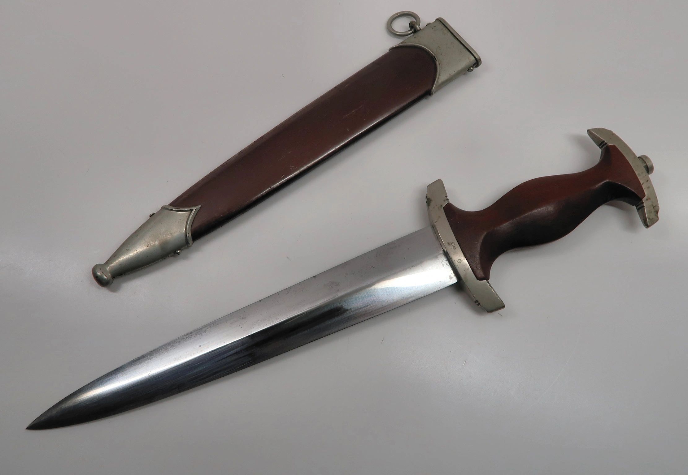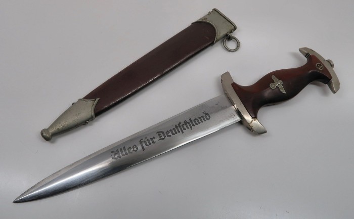 Here is your chance to pick up a really nice full factory ground Röhm SA dagger. What is commonly referred to as a lazy man’s grind as the original name of Ernst Röhm has barely been removed. Even the maker logo was ground away when the original Röhm inscription was removed due to regulation. The blade retains much of it’s original cross grain and the lower cross guard is “Om” marked for the Gau Wartheland region. A beautiful piece for sure and reasonably priced.CLICK HERE to view more images of this item!The Sturmabteilung was the Nazi Party’s original paramilitary wing. It played a significant role in Adolf Hitler’s rise to power in the 1920s and 1930s. Its primary purposes were providing protection for Nazi rallies and assemblies, disrupting the meetings of opposing parties, fighting against the paramilitary units of the opposing parties, especially the Rotfrontkämpferbund of the Communist Party of Germany, and intimidating Romani, trade unionists, and, especially, Jews. The SA were also called the Brownshirts, from the color of their uniform shirts. Brown-colored shirts were chosen as the SA uniform because a large number of them were cheaply available after World War I, having originally been ordered during the war for colonial troops posted to Germany’s former African colonies. After The Night of the Long Knives in 1934, Hitler withdrew support from the SA. The SA continued to exist, but was effectively superseded by the SS, although the paramilitary forces were not formally dissolved until after Nazi Germany’s final capitulation to the Allies in 1945. Free shipping ANYWHERE IN THE WORLD & I don’t charge PayPal fees like some of the other guys!