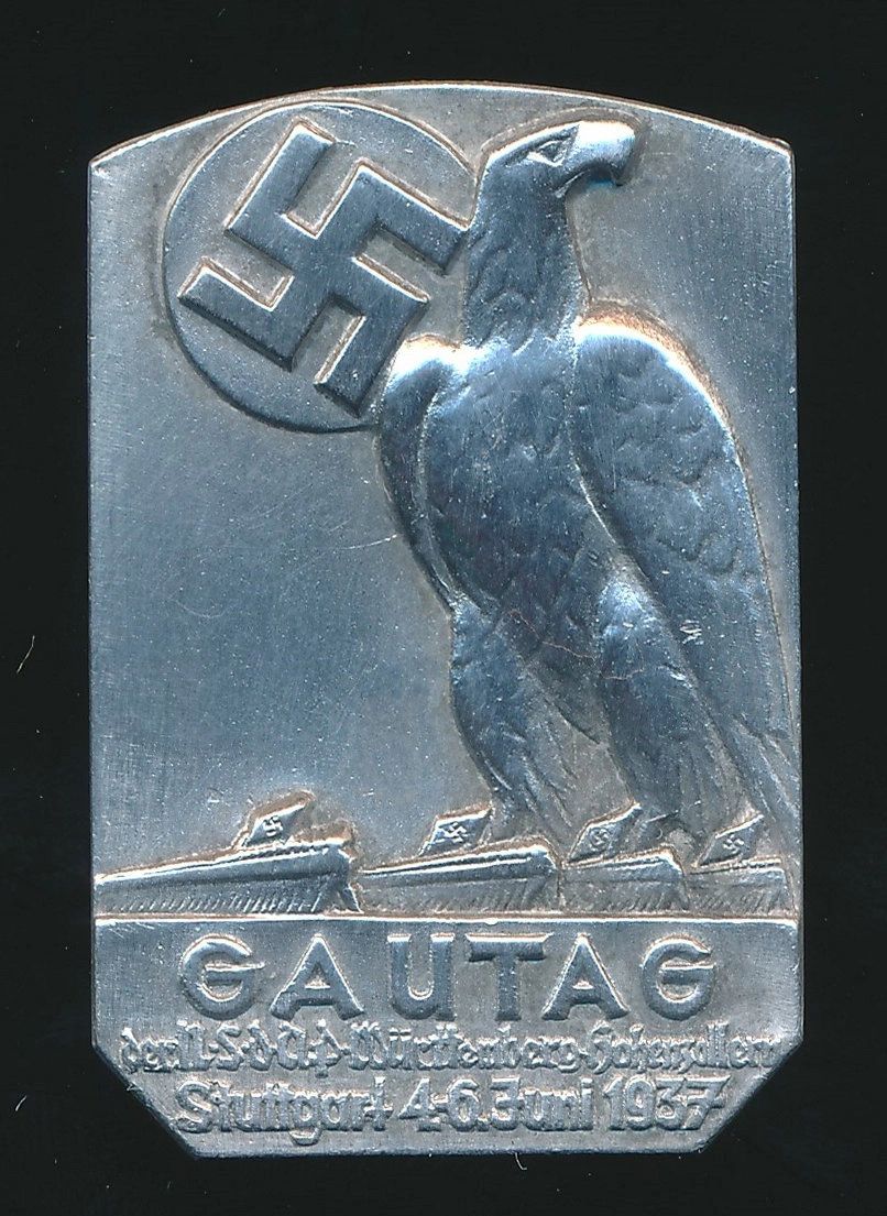 Here is your chance to pick up a wonderful tinnie for a Gautag event. This example is for Württemberg in the city of Stuttgart in 1937. Produced in aluminum. I like pieces like this because not only are they extremely affordable but each one is it’s own little work of art in a sense. This piece is a consignment item and is subject to the terms listed on the website. Guaranteed original. The National Socialist German Workers’ Party ( Nationalsozialistische Deutsche Arbeiterpartei , abbreviated NSDAP), was a far-right political party in Germany that was active between 1920 and 1945, that created and supported the ideology of National Socialism. The Nazi Party emerged from the German nationalist, racist and populist Freikorps paramilitary culture, which fought against the communist uprisings in post-World War I Germany. Initially, Nazi political strategy focused on anti-big business, anti-bourgeois, and anti-capitalist rhetoric, although this was later downplayed to gain the support of business leaders, and in the 1930s the party’s main focus shifted to anti-Semitic and anti-Marxist themes. Adolf Hitler, the party’s leader since 1921, was appointed Chancellor of Germany by President Paul von Hindenburg on 30 January 1933. Hitler rapidly established a totalitarian regime known as the Third Reich. After the death of President Hindenburg on 2 August 1934, Hitler merged the offices of party leader, head of state and chief of government in one, taking the title of Führer und Reichskanzler . The NSDAP would control Germany until the end of the war. Free shipping ANYWHERE IN THE WORLD & I don’t charge PayPal fees like some of the other guys!
