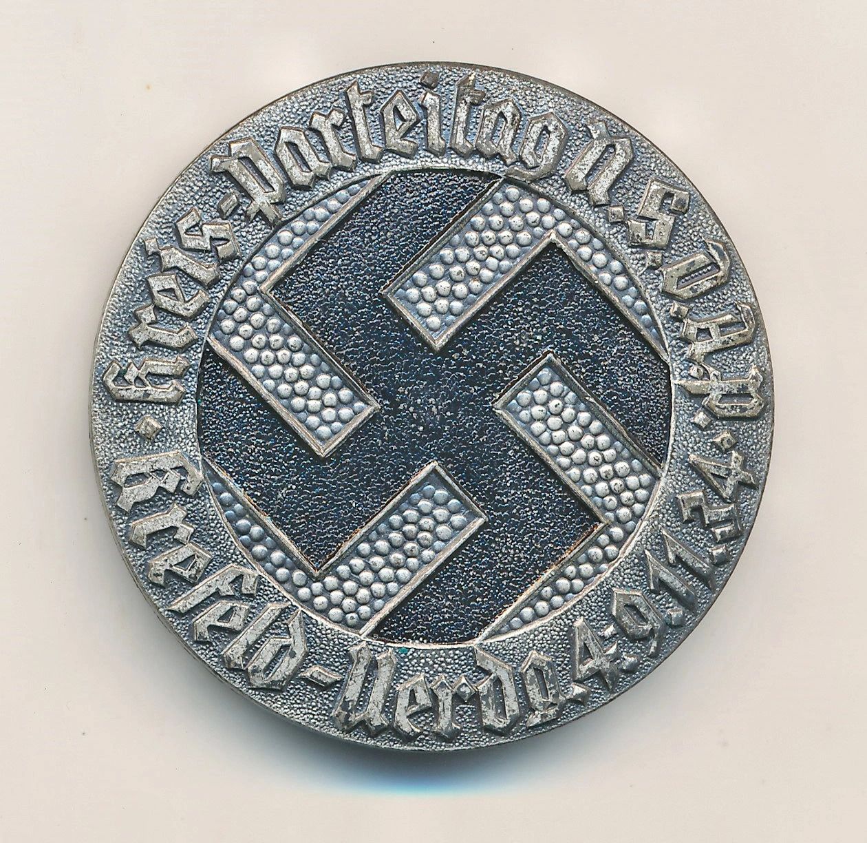 Here is your chance to pick up a wonderful tinnie with from a 1934 Kreistag event. I like pieces like this because not only are they extremely affordable but each one is it’s own little work of art in a sense. The National Socialist German Workers’ Party ( Nationalsozialistische Deutsche Arbeiterpartei , abbreviated NSDAP), was a far-right political party in Germany that was active between 1920 and 1945, that created and supported the ideology of National Socialism. The Nazi Party emerged from the German nationalist, racist and populist Freikorps paramilitary culture, which fought against the communist uprisings in post-World War I Germany. Initially, Nazi political strategy focused on anti-big business, anti-bourgeois, and anti-capitalist rhetoric, although this was later downplayed to gain the support of business leaders, and in the 1930s the party’s main focus shifted to anti-Semitic and anti-Marxist themes. Adolf Hitler, the party’s leader since 1921, was appointed Chancellor of Germany by President Paul von Hindenburg on 30 January 1933. Hitler rapidly established a totalitarian regime known as the Third Reich. After the death of President Hindenburg on 2 August 1934, Hitler merged the offices of party leader, head of state and chief of government in one, taking the title of Führer und Reichskanzler . The NSDAP would control Germany until the end of the war.  Free shipping ANYWHERE IN THE WORLD & I don’t charge PayPal fees like some of the other guys!