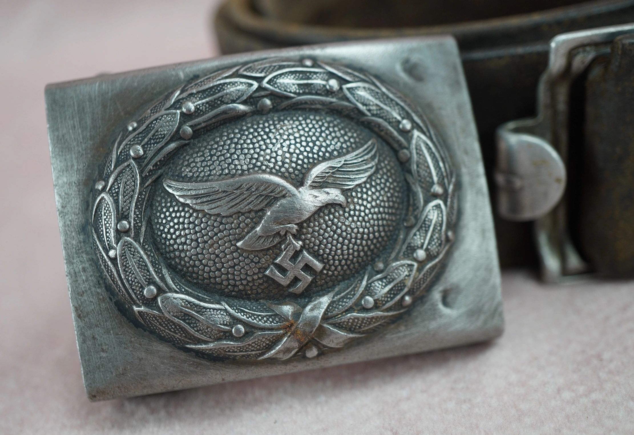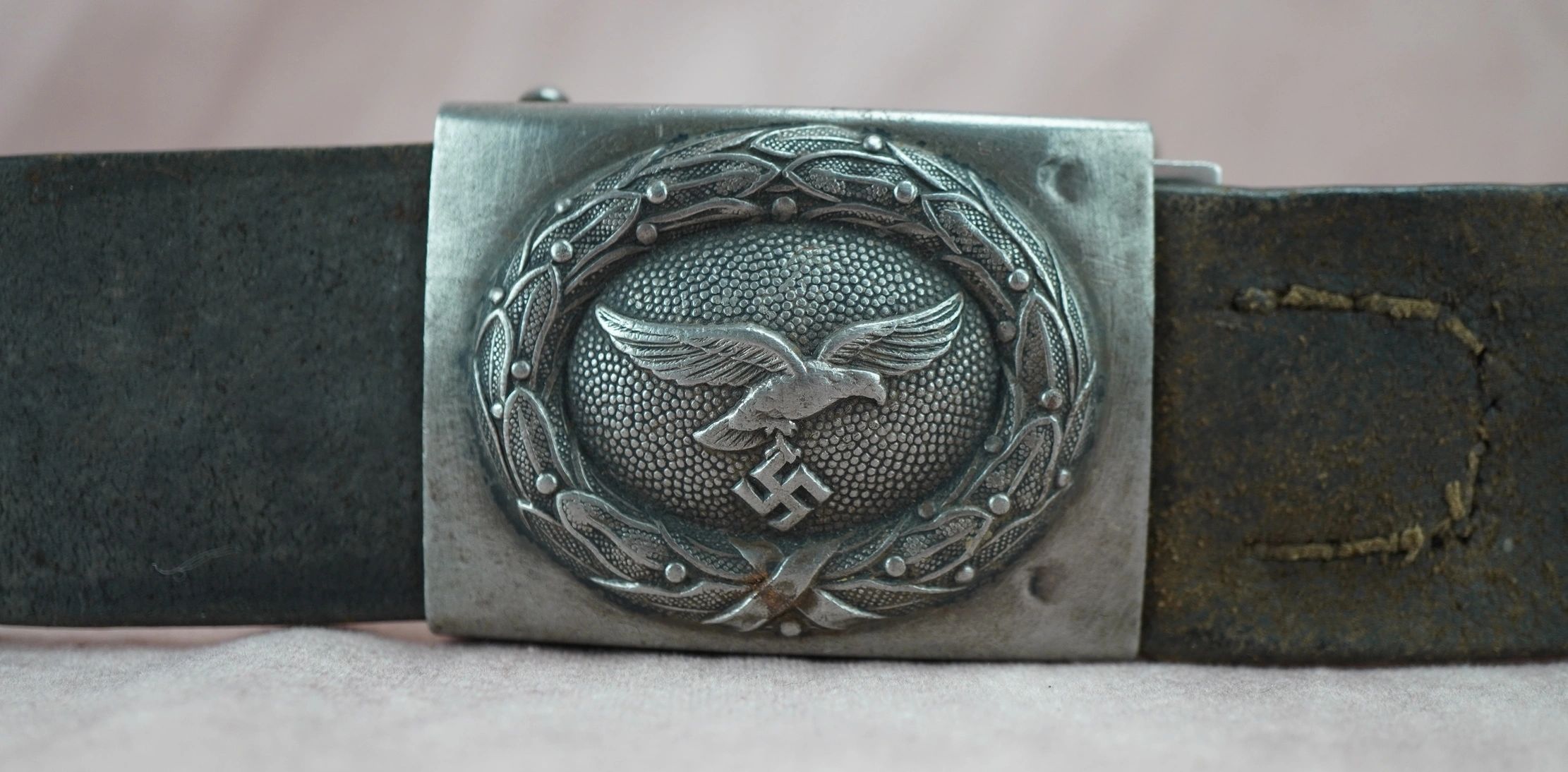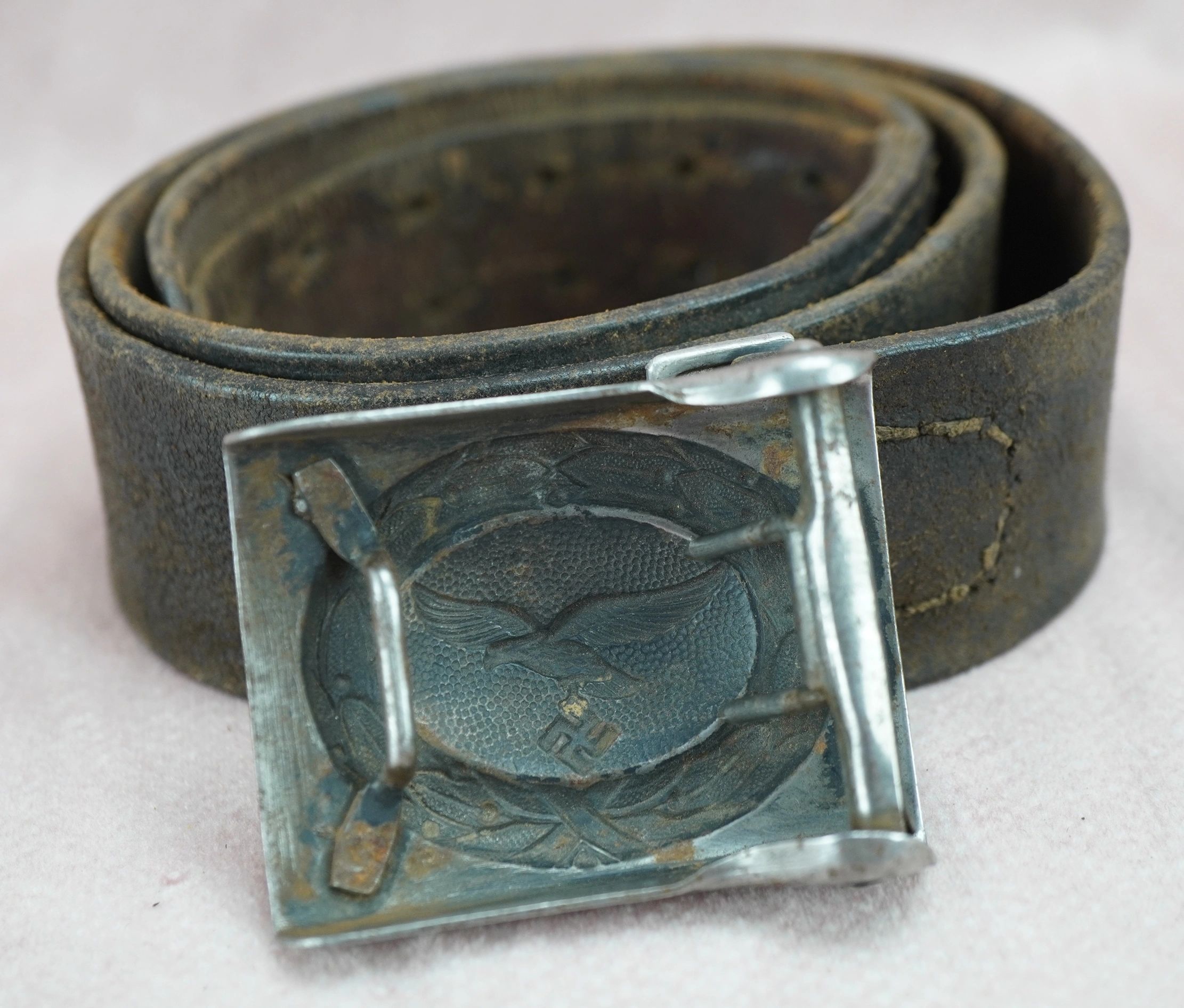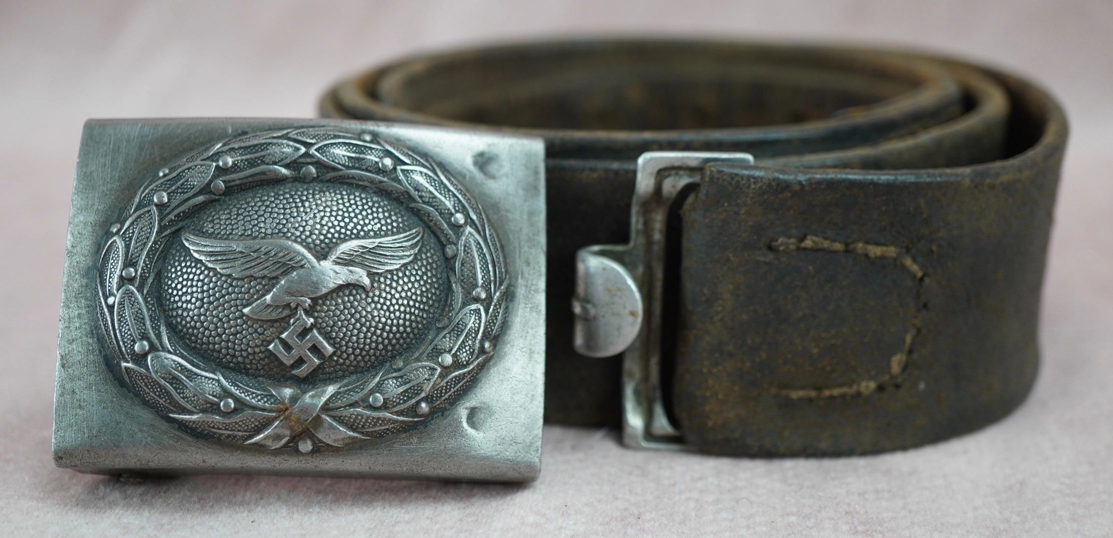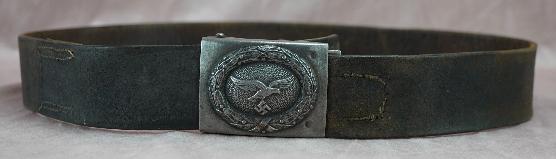 Here is your chance to own a nice worn Luftwaffe buckle and belt. Buckle has a certainly nice worn look to it. Unmarked on the reverse of the buckle. The leather is still supple and is ready for your display. This would pair well with a tunic of the period and generally speaking would look great on display with other period items! Absolutely guaranteed authentic. With the rise of the Nazi Party and the repudiation of the Versailles Treaty, the Luftwaffe’s existence was publicly acknowledged on 26 February 1935, just over two weeks before open defiance of the Versailles Treaty through German re-armament and conscription would be announced on 16 March. The Condor Legion, a Luftwaffe detachment sent to aid Nationalist forces in the Spanish Civil War, provided the force with a valuable testing ground for new tactics and aircraft. Partially as a result of this combat experience, the Luftwaffe had become one of the most sophisticated, technologically advanced, and battle-experienced air forces in the world when World War II broke out in 1939. The Luftwaffe also operated Fallschirmjäger paratrooper units.The Luftwaffe proved instrumental in the German victories across Poland and Western Europe in 1939 and 1940. During the Battle of Britain, however, despite inflicting severe damage to the RAF’s infrastructure and, during the subsequent Blitz, devastating many British cities, the German air force failed to batter the beleaguered British into submission. From 1942, Allied bombing campaigns gradually destroyed the Luftwaffe ‘s fighter arm. From late 1942, the Luftwaffe used its surplus ground, support and other personnel to raise Luftwaffe Field Divisions. In addition to its service in the West, the Luftwaffe operated over the Soviet Union, North Africa and Southern Europe. Despite its belated use of advanced turbojet and rocket propelled aircraft for the destruction of Allied bombers, the Luftwaffe was overwhelmed by the Allies’ superior numbers and improved tactics, and a lack of trained pilots and aviation fuel. In January 1945, during the closing stages of the Battle of the Bulge, the Luftwaffe made a last-ditch effort to win air superiority, and met with failure. With rapidly dwindling supplies of petroleum, oil, and lubricants after this campaign, and as part of the entire combined Wehrmacht military forces as a whole, the Luftwaffe ceased to be an effective fighting force. Free shipping ANYWHERE IN THE WORLD & I don’t charge PayPal fees like some of the other guys!