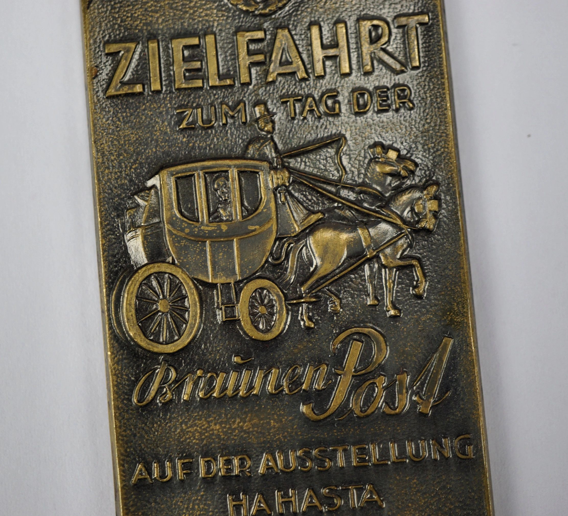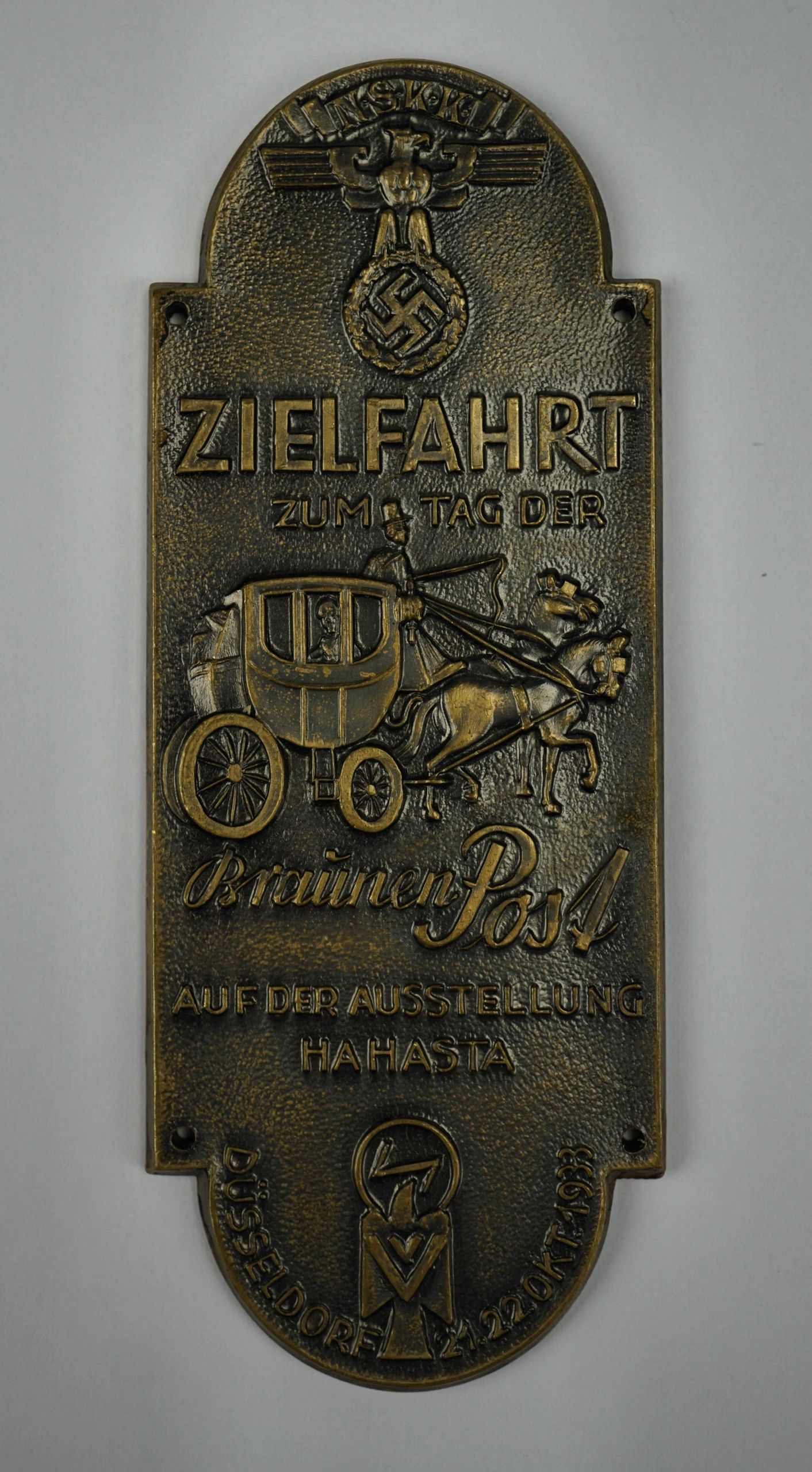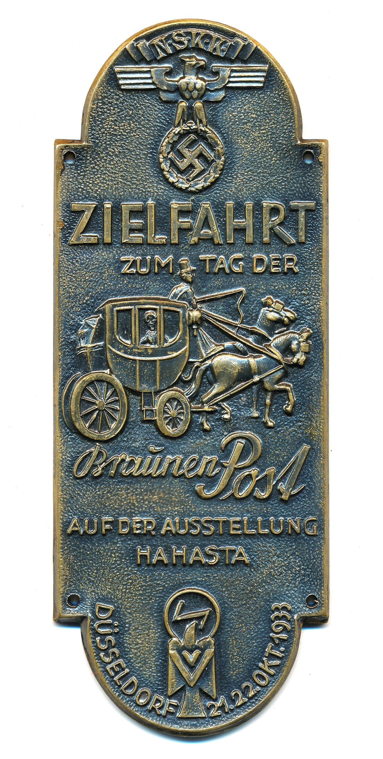 Here is your chance to own a nice NSKK racing plaque. This example is for a race on the Tag der Braunen Post 1933 in Dusseldorf. This example likely was attached to a backing at some point but will look great in a riker mount. The National Socialist Motor Corps (German: Nationalsozialistisches Kraftfahrkorps, NSKK) was a paramilitary organization of the Nazi Party (NSDAP) that officially existed from May 1931 to 1945.  The NSKK served as a training organization, mainly instructing members in the operation and maintenance of high-performance motorcycles and automobiles. The NSKK was further used to transport NSDAP and SA officials/members. With the outbreak of World War II NSKK ranks were recruited to serve in the transport corps of various German military branches.Free shipping ANYWHERE IN THE WORLD & I don’t charge PayPal fees like some of the other guys!