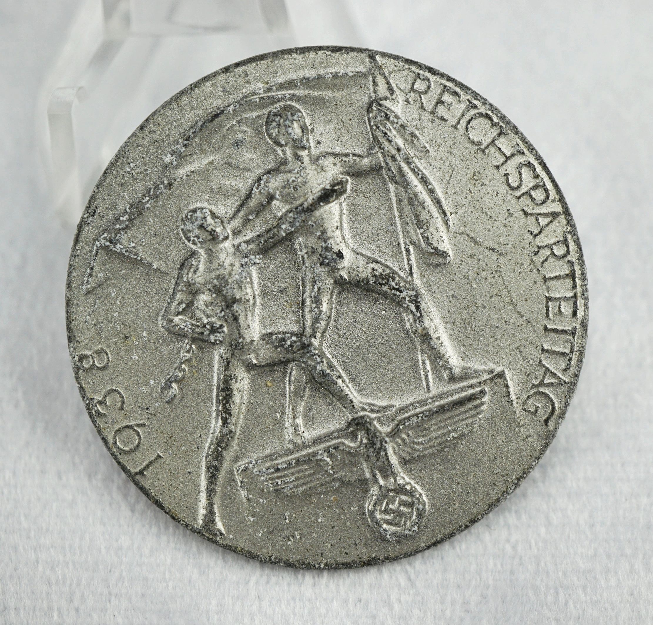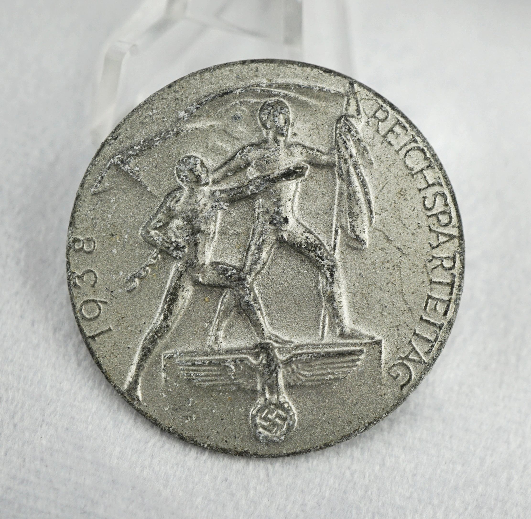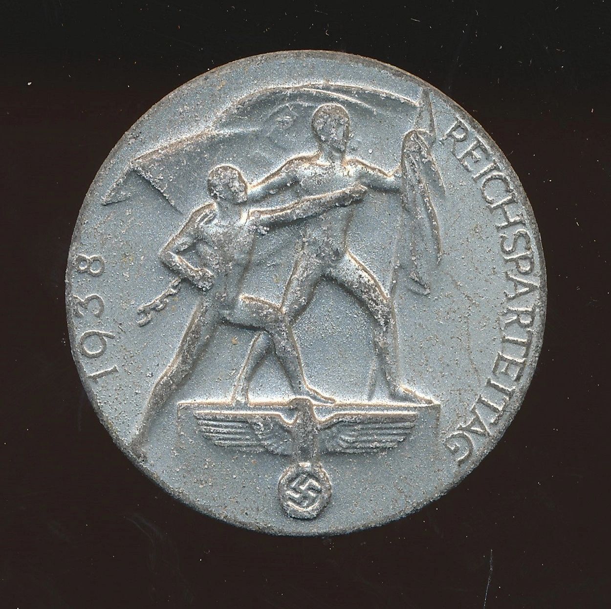 Here is your chance to pick up a wonderful tinnie for Reichsparteitag 1938. Produced in zinc with a fair amount of finish remaining. Maker marked on the reverse. I like pieces like this because not only are they extremely affordable but each one is it’s own little work of art in a sense.The National Socialist German Workers’ Party (Nationalsozialistische Deutsche Arbeiterpartei, abbreviated NSDAP), was a far-right political party in Germany that was active between 1920 and 1945, that created and supported the ideology of National Socialism. The Nazi Party emerged from the German nationalist, racist and populist Freikorps paramilitary culture, which fought against the communist uprisings in post-World War I Germany. Initially, Nazi political strategy focused on anti-big business, anti-bourgeois, and anti-capitalist rhetoric, although this was later downplayed to gain the support of business leaders, and in the 1930s the party’s main focus shifted to anti-Semitic and anti-Marxist themes. Adolf Hitler, the party’s leader since 1921, was appointed Chancellor of Germany by President Paul von Hindenburg on 30 January 1933. Hitler rapidly established a totalitarian regime known as the Third Reich. After the death of President Hindenburg on 2 August 1934, Hitler merged the offices of party leader, head of state and chief of government in one, taking the title of Führer und Reichskanzler. The NSDAP would control Germany until the end of the war. Free shipping ANYWHERE IN THE WORLD & I don’t charge PayPal fees like some of the other guys!
